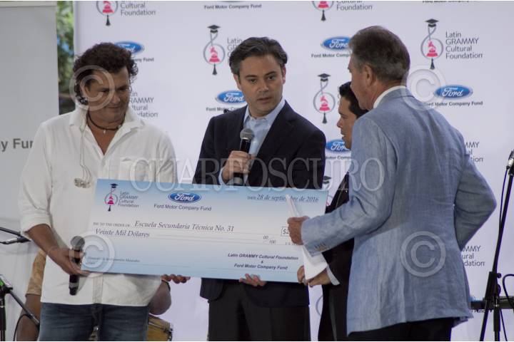 CIUDAD DE MÉXICO, 28SEPTIEMBRE2016.- Carlos Vives, músico colombiano; Aurelio Nuño, secretario de Educación Pública; Joe Ávila, gerente de responsabilidad social de la Ford Compan, y Manolo Díaz, vicepresidente de Latin Grammy Cultural Foundation, durante la donación de un cheque por 20,000 dólares a la Escuela Secundaria Técnica No.31 “Ing. Roberto Medellín Ostros”. Con el fin de contribuir al apoyo y desarrollo de talento musical en la institución. FOTO: GALO CAÑAS /CUARTOSCURO.COM