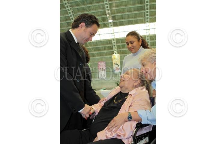 MÉXICO, D.F., 19JUNIO2010.- Bernardo de la Garza, titular de la Comisión Nacional de Cultura Física y Deporte se despide de Carmelita, viuda del clavadista mexicano Joaquín Capilla, ganador de diversas medallas olímpicas obtenidas en distintos Juegos Olímpicos, Centroamericanos y Panamericanos, al termino de un homenaje póstumo que se celebró en la fosa de clavados de las instalaciones del Comité Olímpico Mexicano. FOTO: RODOLFO ANGULO/CUARTOSCURO.COM