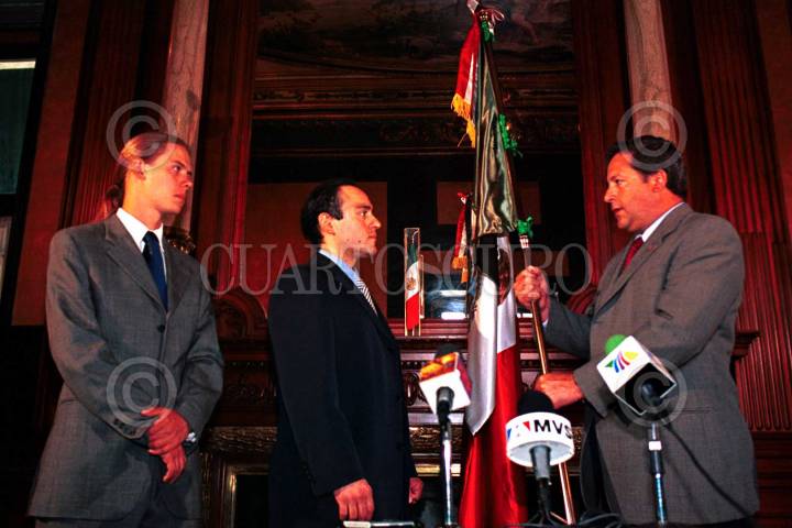 Guillermo Caro e Ivan Laredo fueron abanderados por José María Faustro en el aeropuerto capitalino, momentoa antes de partir a la expedición al Monte Everest, donde trataran de subir a la cima de esta montaña sin oxigeno artificial. FOTO: Eunicer Adorno/CUARTOSCURO.COM