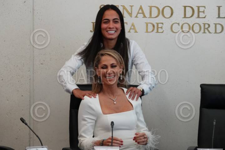 Carolina Jiménez, mediocampista del equipo de las Chivas, saludó a Inés Sainz Gallo, presentadora de TV, durante su presentación en la sala de la JUCOPO en el Senado de la República