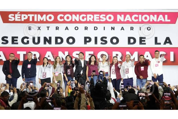 CIUDAD DE MÉXICO, 22SEPTIEMBRE2024.- Durante el Séptimo Congreso Nacional Extraordinario de Morena tomaron protesta para cargos del partido: Arturo Martínez Núñez, secretario de Artes y Cultura; Camila Martínez Gutiérrez, secretaria de Comunicación; Andrés Manuel López Beltrán, secretario de Organización; Luisa María Alcalde Luján, presidenta; Carolina Rangel Gracida, secretaria General; Manuel Alejandro Robles Gómez, secretario de Mexicanos en el Exterior; Aaron Enriquez García, secretario de Jóvenes, y Iván Herrera Zazueta, secretario de Finanzas. El acto se realizó en el World Trade Center. FOTO: GRACIELA LÓPEZ /CUARTOSCURO.COM