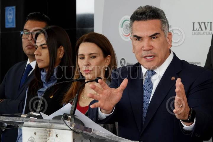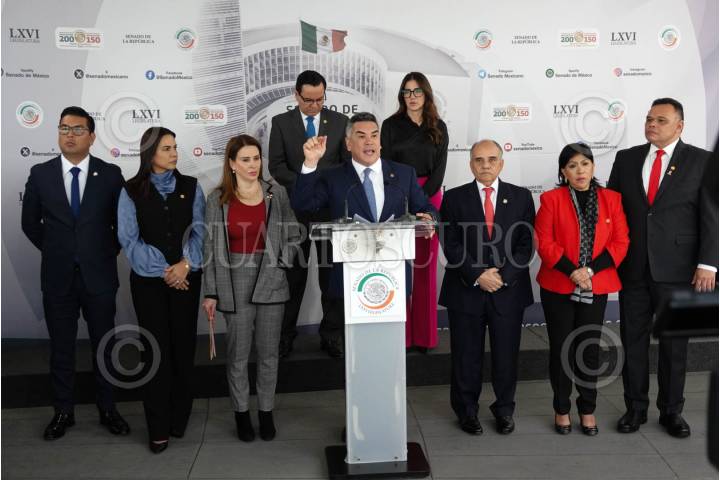 CIUDAD DE MÉXICO, 30OCTUBRE2024.- El senador Alejandro Moreno, coordinador del PRI, acompañado de la bancada del mismo partido durante una conferencia de prensa en el Patio del Federalismo. FOTO: GRACIELA LÓPEZ/CUARTOSCURO.COM