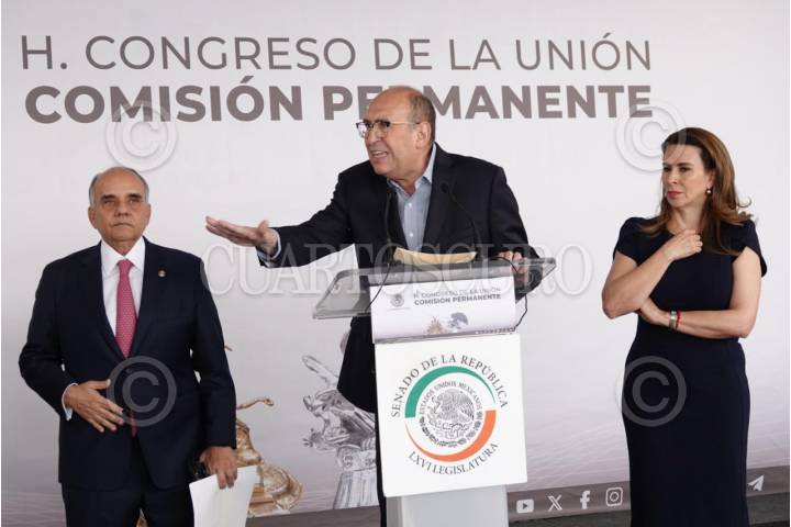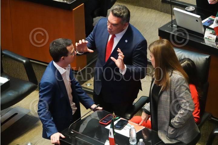 CIUDAD DE MÉXICO, 08SEPTIEMBRE2024.- Los senadores Carolina Viggiano, Alejandra Barrales, Luis Donaldo Colosio Riojas y Amalia García durante la votación del Orden del Día en la Primera Reunión de Comisiones Unidas de Puntos Constitucionales y de Estudios Legislativos en el Senado de la República. FOTO: GRACIELA LÓPEZ /CUARTOSCURO.COM