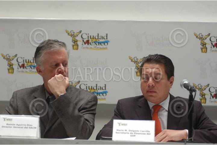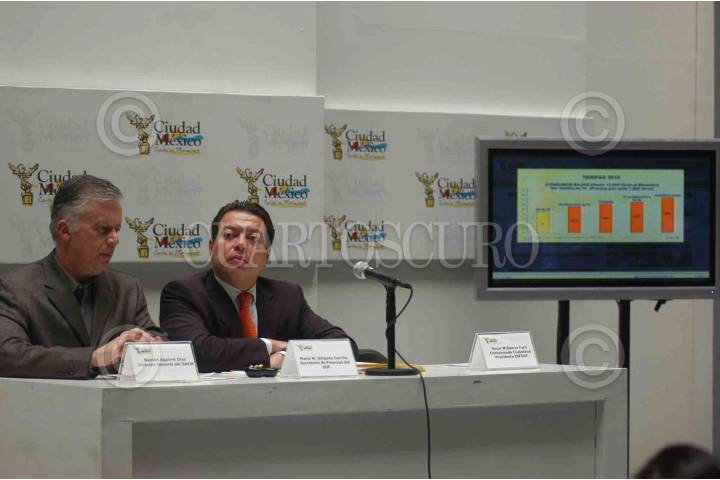 MÉXICO, D.F., 07MARZO2010.- Ramon Aguirre, Director General del SACM junto a Mario M. Delgado Carriño, Secretario de Finanzas del GDF, en conferencia de prensa dieron a conocer el nuevo mapa del Sistema Tarifario del agua de la ciudad. FOTO: IVAN MENDEZ/CUARTOSCURO.COM
