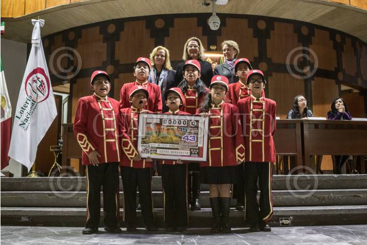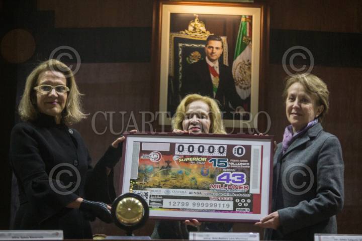 CIUDAD DE MÉXICO, 01DICIEMBRE2017.- Las maestras Sylvia Navarrete, Ana Aurora Lara Martínez, y la licenciada Gilda Salgado, encabezaron el Sorteo INBA y Lotería Nacional conmemorativo al centenario del natalicio de Leonora Carrington, con un billete ilustrado de El Mundo Mágico de los Mayas. FOTO: TERCERO DÍAZ /CUARTOSCURO.COM