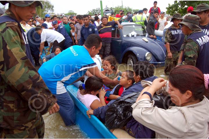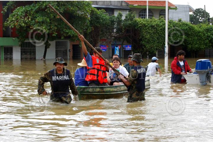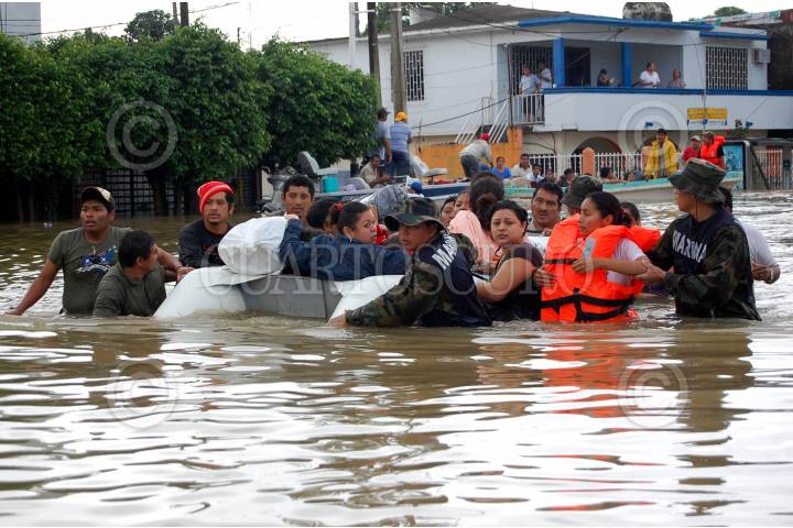 VILLAHERMOSA, TABASCO, 01NOVIEMBRE2007.- Tabasqueños y autoridades estatales y federales se unen para ayudar a rescatar a los habitantes que se encuentran inundados por los desbordamientos de los ríos Grijalva y Carrizal en la colonia Gaviotas, Casa Blanca y La Manga. Estos lugares son los más criticos en donde el nivel del agua sobre pasa los cinco metros de profundidad y aun hay más habitantes que rescatar que están pidiendo auxilio por sus vidas. FOTO: MARCO POLO GUZMÁN HERNÁNDEZ/CUARTOSCURO.COM