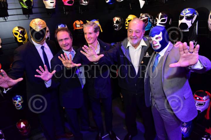 CIUDAD DE MÉXICO., 18OCTUBRE2017.- El hijo de Tinieblas, el hijo de Blue Demón, Alfredo de Mazo Maza, gobernador del Estado de México y Carlos Slim Helú, presidente del grupo Carso, durante la inauguración del salón del deporte fundación Slim. FOTO: CUARTOSCURO.COM