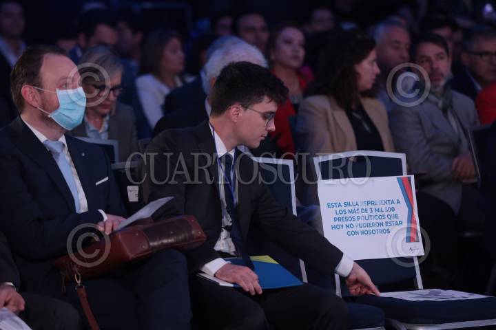 CIUDAD DE MÉXICO, 08NOVIEMBRE2024. Cartel en donde se lee “Esta silla representa los más de 3 mil 500 presos políticos que hoy no pudieron estar con nosotros” durante el Foro America Libre, en donde participan más de 35 organizaciones, ONG, think tanks y fundaciones políticas de más de 25 países. El foro intenta ser un punto de encuentro y referencia del centro liberal-democrático en las Américas. FOTO: EDGAR NEGRETE LIRA/CUARTOSCURO.COM