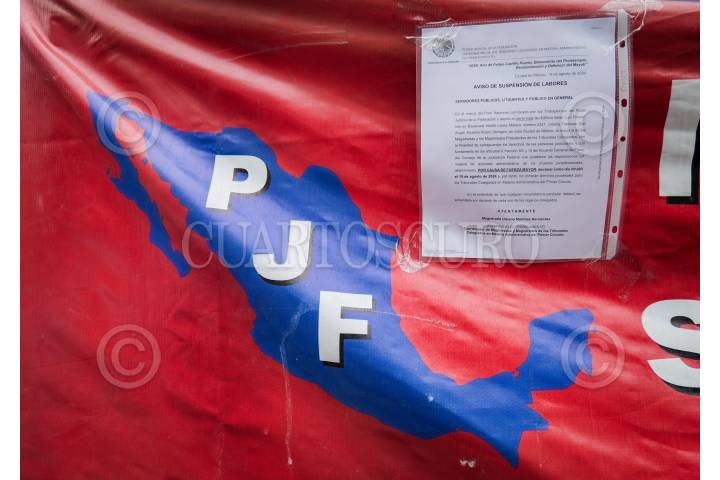 CIUDAD DE MÉXICO, 19AGOSTO2024.- Trabajadores del Poder Judicial de la Federación (PJF) pegaron su aviso de suspensión de labores en un cartel del PJF frente a la sede Las Flores durante el paro de labores en protesta contra la reforma propuesta por el Ejecutivo Federal, que según ellos, amenaza la independencia judicial y los derechos laborales. Diversos colectivos han convocado a la sociedad a unirse en defensa del país. FOTO: ALICE MORITZ/CUARTOSCURO.COM