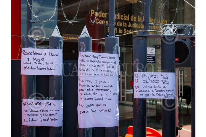 CIUDAD DE MÉXICO, 20AGOSTO2024.- Varios carteles fueron pegados a las puertas de la sede del San Lázaro del Poder Judicial durante el segundo día de paro de labores por parte de trabajadores del Poder Judicial de la Federación (PJF) en protesta contra la reforma propuesta por el Ejecutivo Federal, que según ellos, amenaza la independencia judicial y los derechos laborales. Diversos colectivos han convocado a la sociedad a unirse en defensa del país. FOTO: ALICE MORITZ/CUARTOSCURO.COM