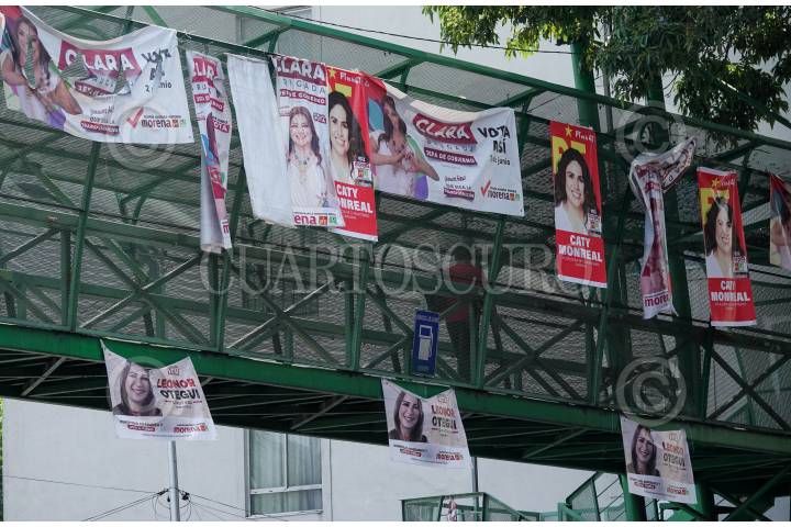 CIUDAD DE MÉXICO, 12ABRIL2024.- Cientos de lonas, carteles y estampas con la cara de las y los candidatos a puestos de elección popular inundan las calles de la Ciudad de México. Este tipo de publicidad se encuentran impresos en materiales no biodegradables lo que genera un fuerte problema de basura y contaminación. FOTO: GALO CAÑAS/CUARTOSCURO.COM