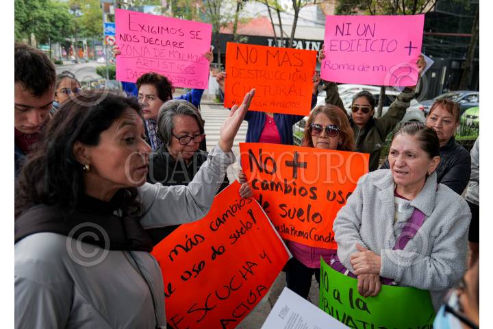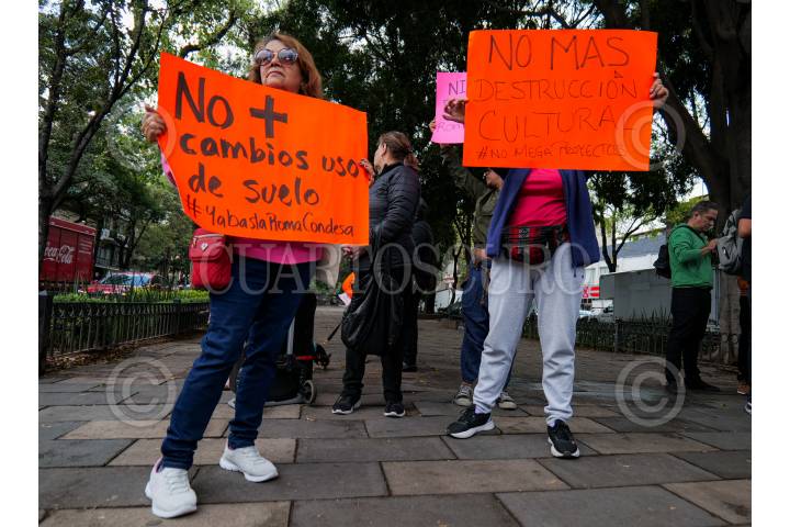 CIUDAD DE MÉXICO, 22AGOSTO2024.- Habitantes de las colonias Roma Norte y Roma Sur protestaron para exigir al presidente Andrés Manuel López Obrador y a al Instituto de Bellas Artes y Literatura (INBAL) que declaren estas colonias como “Zonas de Monumentos Artísticos”, con el propósito de protegerlas de las construcciones inmobiliarias y de los cambios de usos de suelo. Además, pidieron al alcalde de Cuauhtémoc, Raúl Ortega, la suspensión temporal de las construcciones en curso hasta la revisión de los permisos, ya que aseguran que muchos antros y restaurantes no cuentan con la debida autorización, y esas construcciones son, según ellos, favorece la escasez de agua y el incremento de la delincuencia. FOTO: ALICE MORITZ/CUARTOSCURO.COM