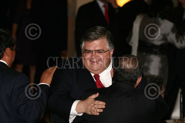 MÉXICO D.F., 09MARZO2009.- El Secretario de Hacienda Agustin Carstens, saluda al periodista Carlos Marín, durante a la cena de honor que el gobierno de México realizó al presidente de Francia Nicolás Sarkozy y a su esposa Carla Sarkozy. FOTO: SAÚL LÓPEZ/CUARTOSCURO.COM