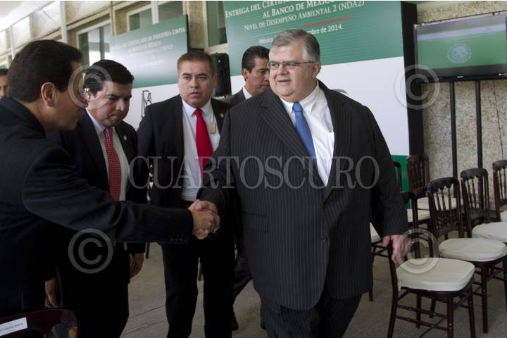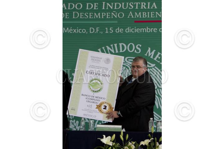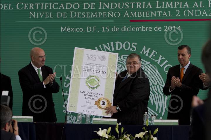 MÉXICO, D.F., 15DICIEMBRE2014.- Agustín Cartens Cartens, Gobernador del Banco de México, recibió de manos de Juan José Guerra Abud Secretario del Medio Ambiente y Recursos Naturales, el “Certificado de Industria Limpia”, que fue otorgado al Banco Central, en el complejo Legaria, Fábrica de Billetes del Banco de México. FOTO: GUILLERMO PEREA /CUARTOSCURO.COM