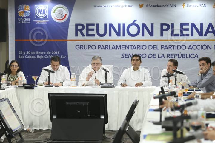 LOS CABOS, BAJA CALIFORNIA SUR., 29ENERO2015.- Agustín Cartens Cartens, Gobernador del Banco de México y Xavier Corral, durante la reunión Plenaria de Senadores del Partido Acción Nacional. FOTO: CUARTOSCURO.COM