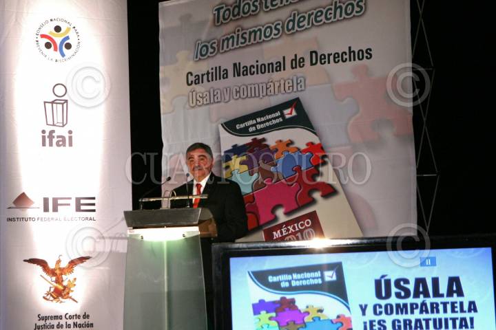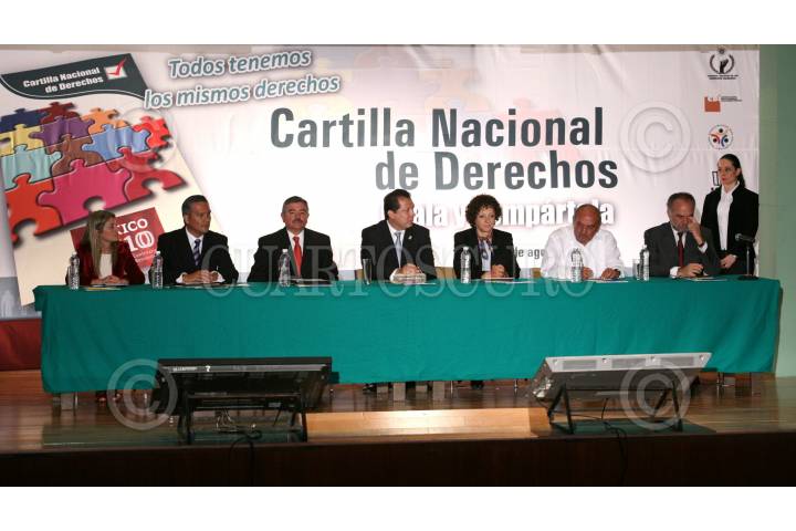 MÉXICO, D.F., 19AGOSTO2010.- Ricardo Antonio Bucio del CONAPRED junto a Leonardo Valdez Zurita, consejero presidente del Instituto Federal Electoral; Raul Placencia Villanueva, Presidente de la Comisión Nacional de los Derechos Humanos; Jacqueline Peschard, Comisionada Presidente del IFAI; Xavier Abreu (CDI) y José de Jesús Orozco comisionado de la Comisión Interamericana de Derechos Humanos durante la Presentación de la Cartlla Nacional de Derechos. FOTO: CUARTOSCURO.COM