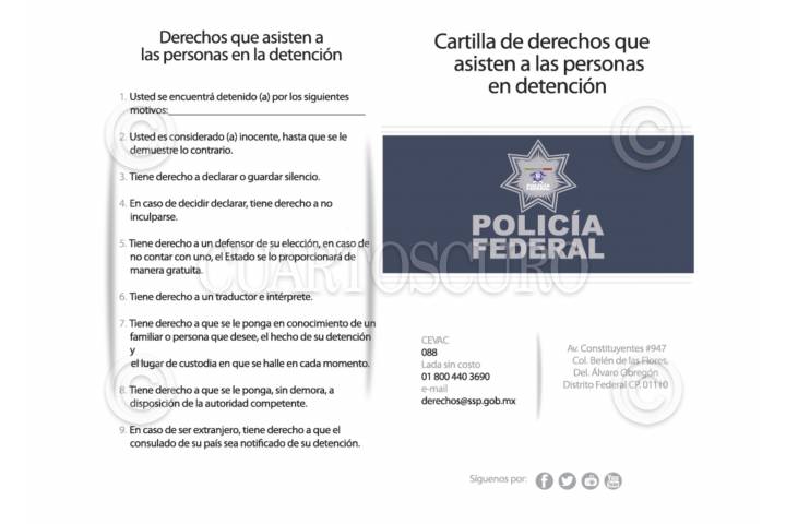MÉXICO, D.F., 25ENERO2013.- La Secretaría de Gobernación dió a conocer la cartilla de derechos que asisten a las personas en detención que deberá aplicar la Policía Federal. Este documento esta compuesto por nueve puntos 1. Usted se encuentra detenido (a) por los sigueintes motivios. 2 Usted es considerado (a) inocente, hasta que se le demuestre los contrario. 3. Tiene derecho a declarar o guardar silencio. 4. En caso de decidir declarar, tiene derecho a no inculparse. 5. Tiene derecho a un defensor de su elección, en caso de no contar con uno, el Estado se lo proporcionará de manera gratuita. 6. Tiene derecho a un traductor e intérprete. 7. Tiene derecho a que se le ponga en conocimiento de un familiar o persona que desee, el hecho de su detención y el lugar de custodia en que se halle en cada momento. 8. Tiene derecho a que se le ponga, sin demora, a disposición de la autoridad competente. 9. En caso de ser extranjero, tiene derecho a que el consulado de su país sea notificado de su detención. FOTO: SEGOB /CUARTOSCURO.COM