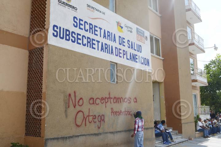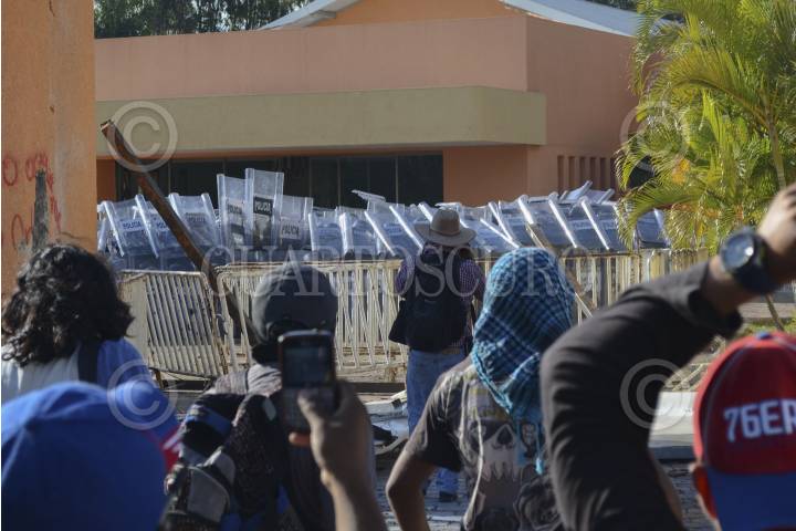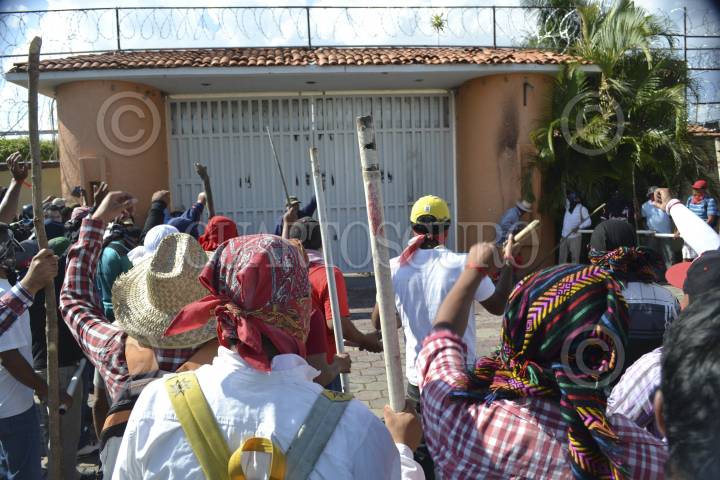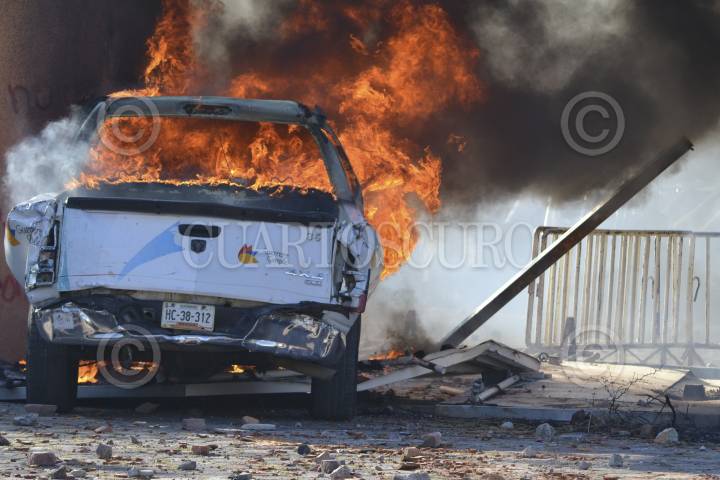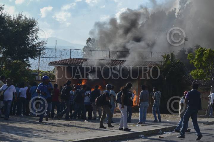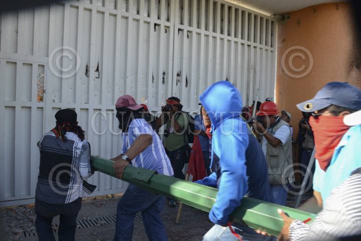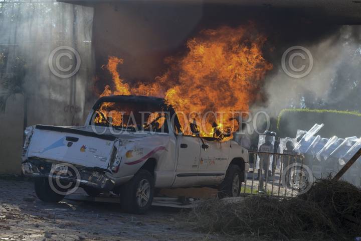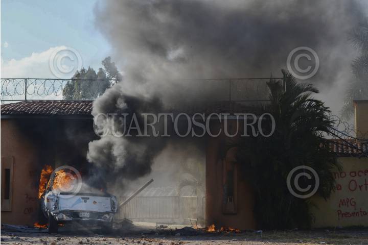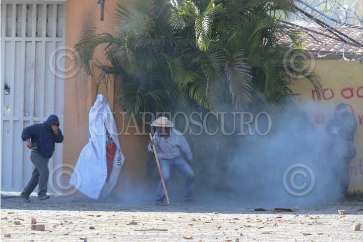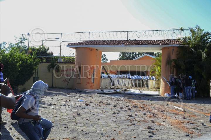 CHILPANCINGO, GUERRERO, 29OCTUBRE2014.- Profesores de la Coordinadora Estatal de Trabajadores de la Educación en Guerrero marcharon del zócalo donde está su plantón hacia casa Guerrero, la movilización termino en enfrentamiento a pedradas, personal de seguridad de la residencia oficial del ejecutivo y granaderos impidieron que los inconformes accesarán al inmueble. Grupos de antimotines lanzo gas lacrimógeno a los manifestantes para dispersarlos, sin embrago no fue suficiente ya que los maestros derribaron con una camioneta la puerta principal. El vehículo que utilizaron fue quemado en la puerta tres de Casa Guerrero. Los maestros pintaron leyendas pidiendo la salida del gobernador sustituto Rogelio Ortega, ya que lo acusan de haber pedido refuerzos de la Fuerzas Federales. FOTO: JOSÉ I. HERNÁNDEZ /CUARTOSCURO.COM