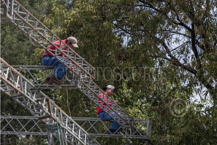 CIUDAD DE MÉXICO, 19JUNIO2018.- Trabajadores llevan a cabo el montaje de un escenario que es colocado a un costado de Casa del Lago en Chapultepec. FOTO: MARIO JASSO /CUARTOSCURO.COM