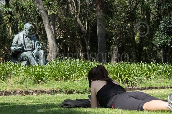 CIUDAD DE MEXICO, 06OCTUBRE2019.- Una joven disfruta la tarde mientras observa su celular recostada en el jardín de la Casa del Lago frente a la estatua de León Felipe, ubicada en la primera sección del Bosque de Chapultepec. FOTO: MAGDALENA MONTIEL /CUARTOSCURO.COM