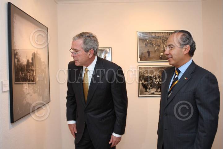 NUEVA ORLEANS, LUISIANA, 21ABRIL2008.- El presidente de México, Felipe Calderón Hinojosa, acompañado del presidente de Estados Unidos George W. Bush, durante un rrecorrido donde admiraron una exposición de fotografias del fotografo Casasola, en la inauguración de la nueva sede del consulado de México en Nueva Orleans. FOTO: ALFREDO GUERRERO/CUARTOSCURO.COM