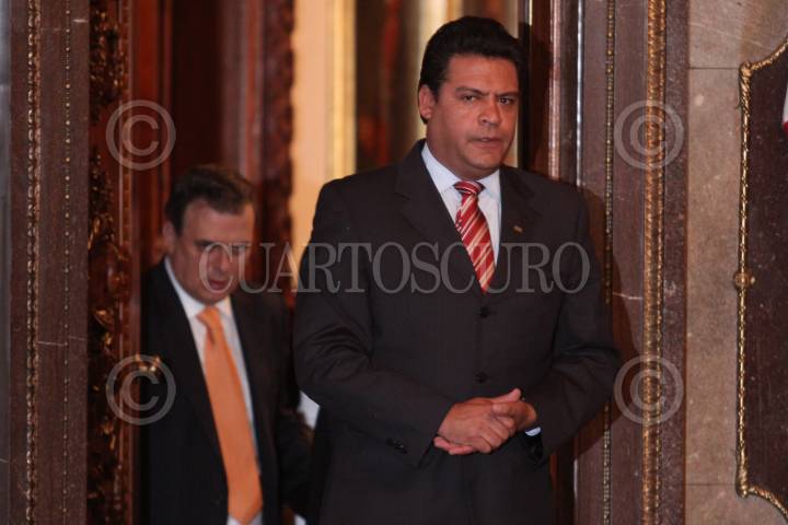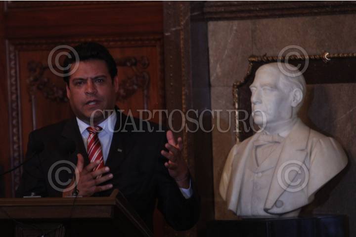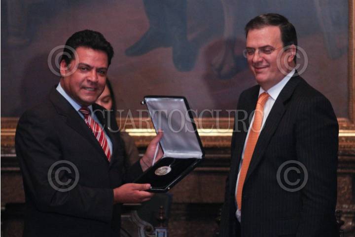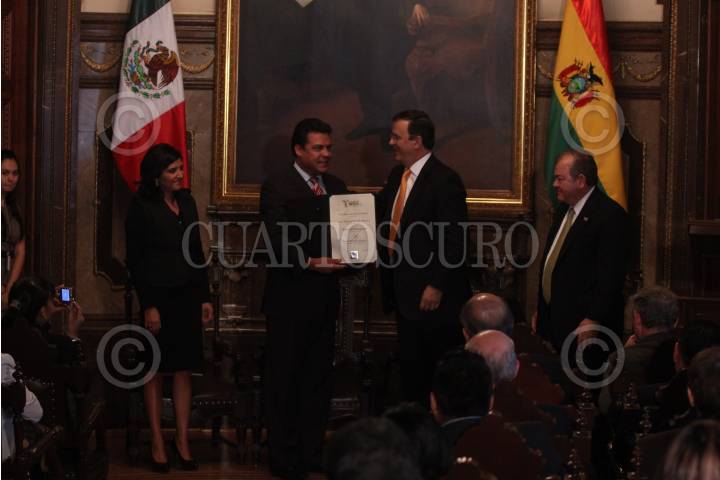 MÉXICO, D.F., 14ABRIL2012.- Marcelo Ebrard Casaubon, Jefe de Gobierno Capitalino, durante la reunión que sostuvo con el alcalde de La Paz, Bolivia, Luis Antonio Revilla, en la cual le entregó las llaves de la ciudad al que llamó un huésped distinguido. FOTO: ENRIQUE ORDÓÑEZ /CUARTOSCURO.COM