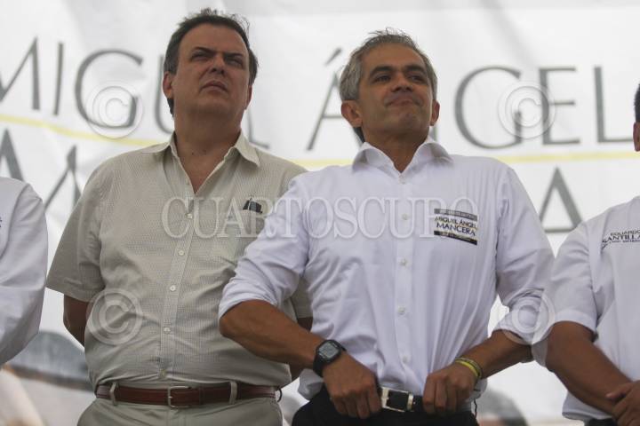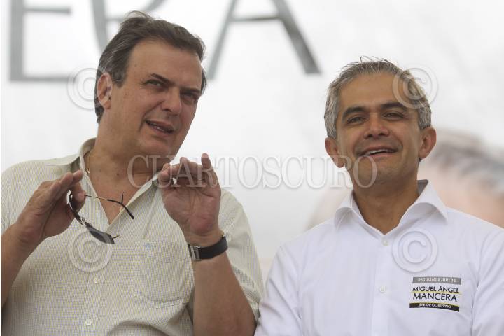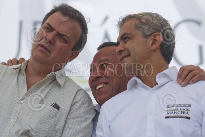 MÉXICO, D.F., 20MAYO2012.- Marcelo Ebrard Casaubon, jefe de gobierno capitalino junto a Miguel Ángel Mancera durante el inicio de campaña de Leonel Lunas, candidato del PRD a la jefatura delegacional en Álvaro Obregón. FOTO: ENRIQUE ORDÓÑEZ /CUARTOSCURO.COM