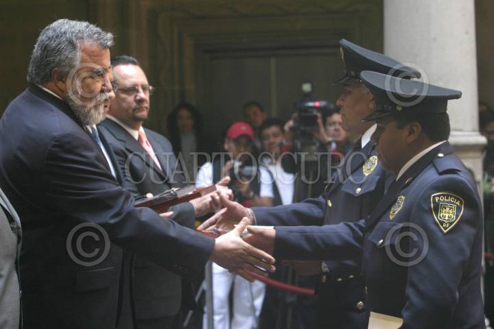 MEXICO, D.F. 13FEBRERO2006.- Alejandro Encinas, jefe de gobierno de la ciudad de México entregó a los policias auxiliares Marco Antonio Casique y Jose Ismael López Alvarado Ruíz un reconocimiento por la detención de la mata viejitas. FOTO: Nelly Salas/CUARTOSCURO.COM