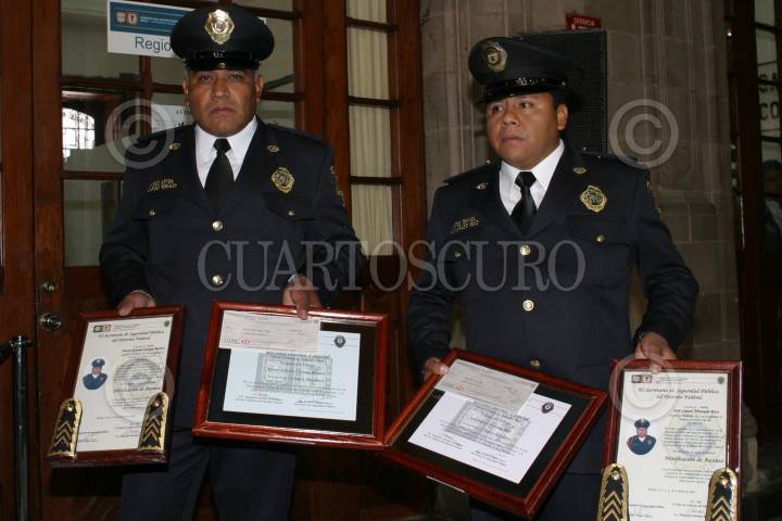 MEXICO, D.F. 13FEBRERO2006.- Los policias auxiliares Marco Antonio Casique y Jose Ismael López Alvarado Ruíz recibieron un reconocimiento de manos del jefe de gobierno del D.F. por la detención de la mata viejitas. FOTO: Nelly Salas/CUARTOSCURO.COM