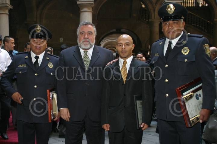 MEXICO, D.F. 13FEBRERO2006.- Alejandro Encinas, jefe de gobierno del D.F. se toma la foto con Los policias auxiliares Marco Antonio Casique y Jose Ismael López Alvarado Ruíz y Jose Joel López González, quines detuvieron y denunció respectivamente a la mata viejitas. FOTO: Nelly Salas/CUARTOSCURO.COM
