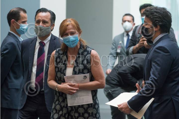 Tatiana Clouthier, secretaria de Economía; Cuitláhuac García, gobernador de Veracruz, y Cassiano de Stefano, presidente de Grupo Modelo, durante el anuncio de inversión de un total de 3,080 millones de pesos por parte de Grupo Modelo en la planta de producción de vidrio ubicada en Terrablanca, Veracruz.