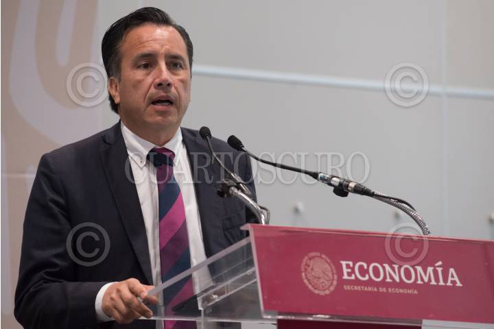 Cuitláhuac García, gobernador de Veracruz, durante el anuncio de inversión de un total de 3,080 millones de pesos por parte de Grupo Modelo en la planta de producción de vidrio ubicada en Terrablanca, Veracruz.