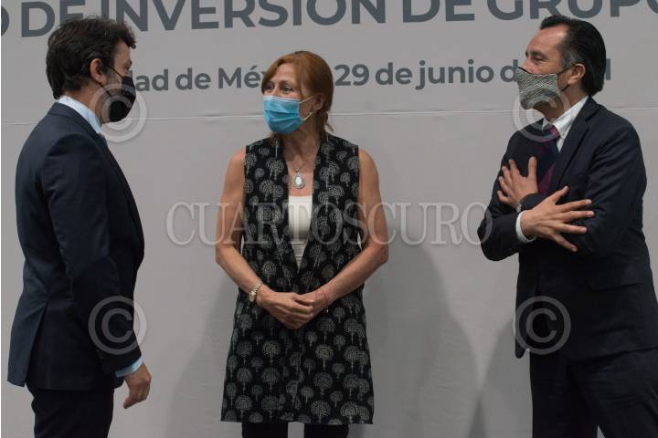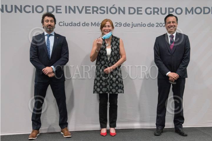 Cassiano de Stefano, presidente de Grupo Modelo; Tatiana Clouthier, secretaria de Economía, y Cuitláhuac García, gobernador de Veracruz, durante el anuncio de inversión de un total de 3,080 millones de pesos por parte de Grupo Modelo en la planta de producción de vidrio ubicada en Terrablanca, Veracruz.