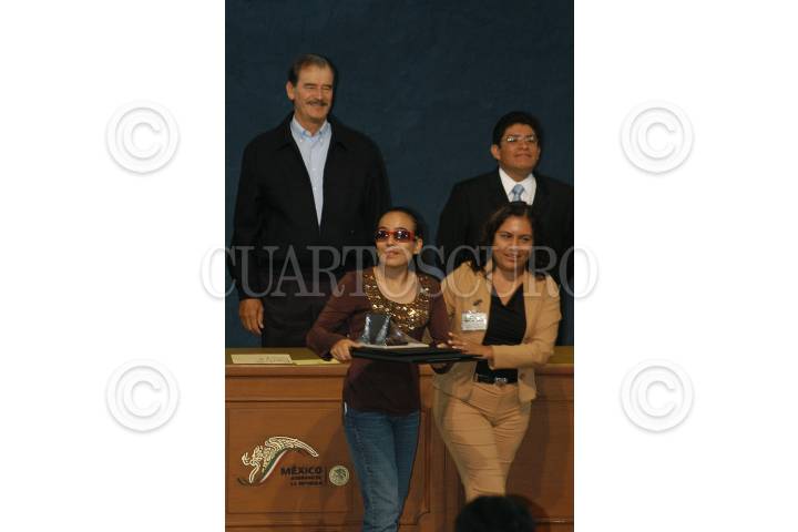 MÉXICO, D.F. 06SEPTIEMBRE2006.- Reyes Tamez Guerra, secretario de Educación Pública, Vicente Fox Quesada, presidente de México, y el director del Insittuto Mexicano de la Juventud, Cristian Castaño Moreno, durante la ceremonia de entrega del premio nacional de la Juventud. FOTO: Iván Stephens/CUARTOSCURO.COM