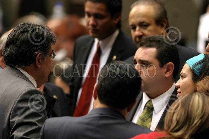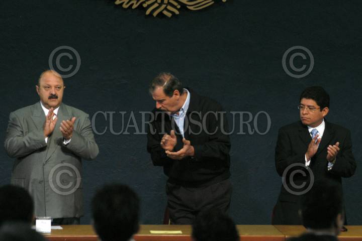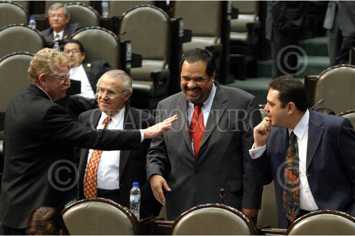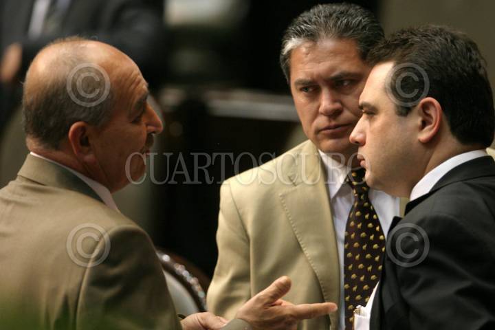 MÉXICO D.F. 07NOVIEMBRE2006.- Los diputados José González Garza coordinador de la bancada del PRD, junto con Juan José Rodríguez Prats, Hector Larios coordinador de la bancada del PAN y el diputado Cristian Castaño Contreras, durante la sesión donde se realizo las votaciones en las que se le nego ausentarse del país al presidente Vicente Fox en la Cámara de Diputados. FOTO: GUILLERMO PEREA/CUARTOSCURO.COM
