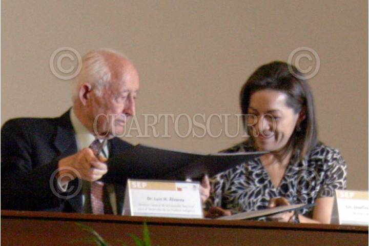 MÉXICO. D.F. 14SEPTIEMBRE2007.- Josefina Vázquez Mota, Secretaria de Educación Pública firmó un convenio con la Comisión Nacional Para el Desarrollo de los Pueblos Indigenas en el evento partciparon Xavier Abreu Sierra, Luiz H Alvarez y Julio Castellanos. FOTO:RICARDO CASTELAN CRUZ/CUARTOSCURO.COM