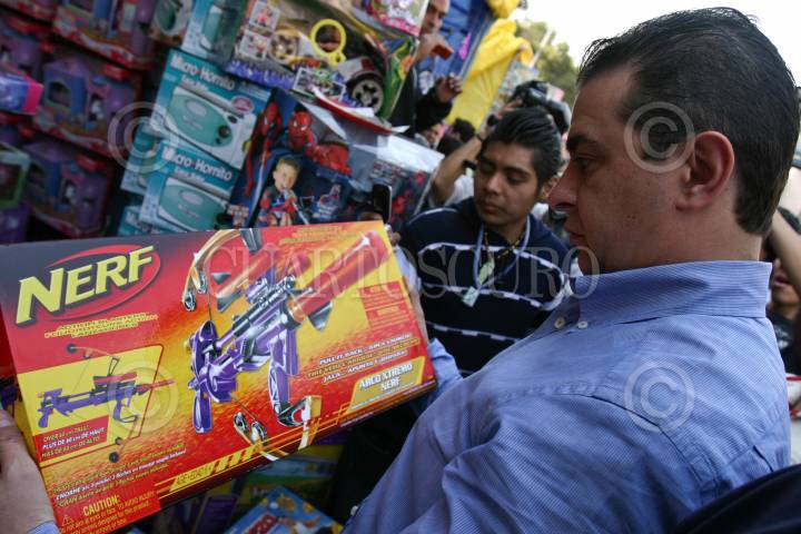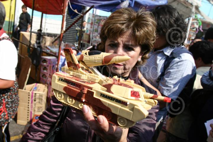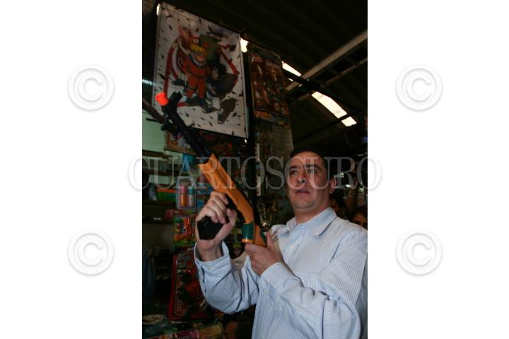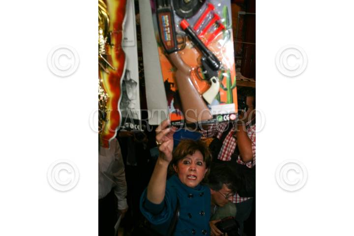 MÉXICO, D.F., 03ENERO2009.- Los diputados locales María del Carmen Segura Rangel y Agustín Castilla realizaron un recorrido por calles del centro histórico en donde en esta temporada se venden juguetes bélicos. El objetivo es combatir y evitar la venta ilegal e irregular de juguetes con forma de arma de fuego, pues muchas veces son utilizados para cometer actos ilícitos por sus características similares a las reales. FOTO: RODOLFO ANGULO/CUARTOSCURO.COM
