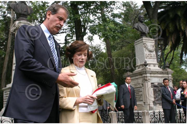 México, D.F. 05 ABRIL 2004.- Vicente Fox, primer mandatario y María Teresa Juárez viuda de Castillo, se retiran del monumento de Heberrto Castillo, al término de la ceremonia de inhumación en el panteón Dolores. FOTO: Sandra Perdomo/CUARTOSCURO.COM