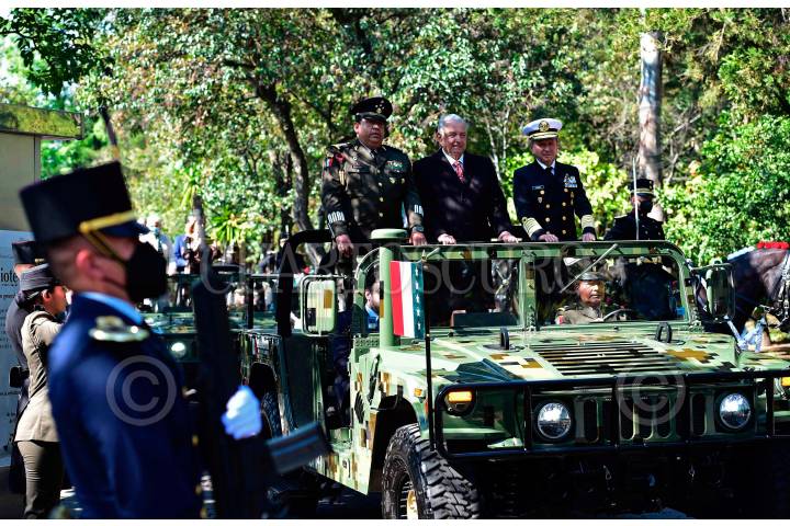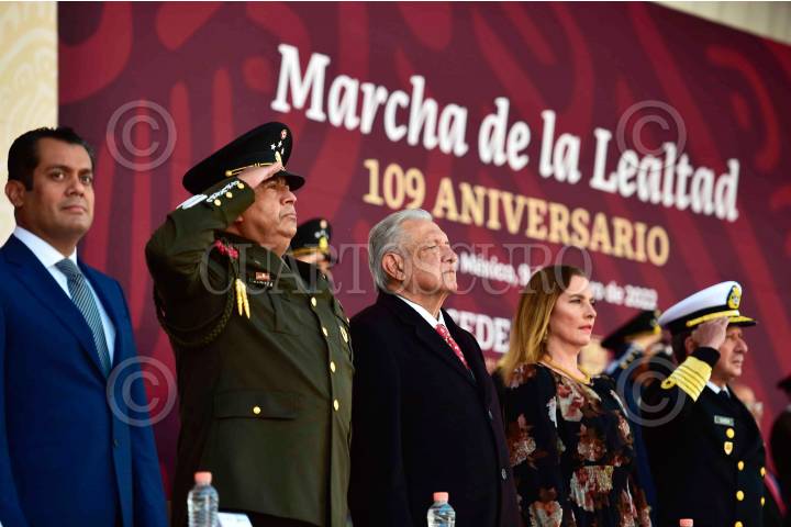 Agustín Radilla Suastegui, Subsecretario de la Defensa Nacional; Andrés Manuel López Obrador, Presidente de México; Beatriz Gutiérrez Müller, esposa del Jefa del Ejecutivo, y José Rafael Ojeda Durán, secretario de Marina, durante la ceremonia del 109 Aniversario de la Marcha de la Lealtad.