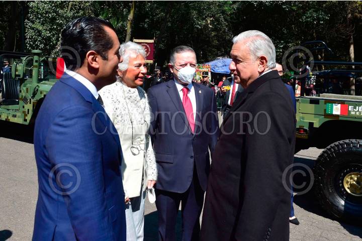 Sergio Gutiérrez Luna, presidente de la Cámara de Diputados; Olga Sánchez Cordero, presidenta de la Cámara de Senadores; Arturo Zaldívar, ministro presidente de la SCJN, y Andrés Manuel López Obrador, Presidente de México, charlan en la ceremonia del 109 Aniversario de la Marcha de la Lealtad.