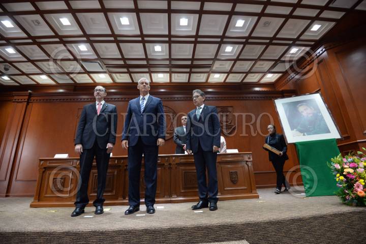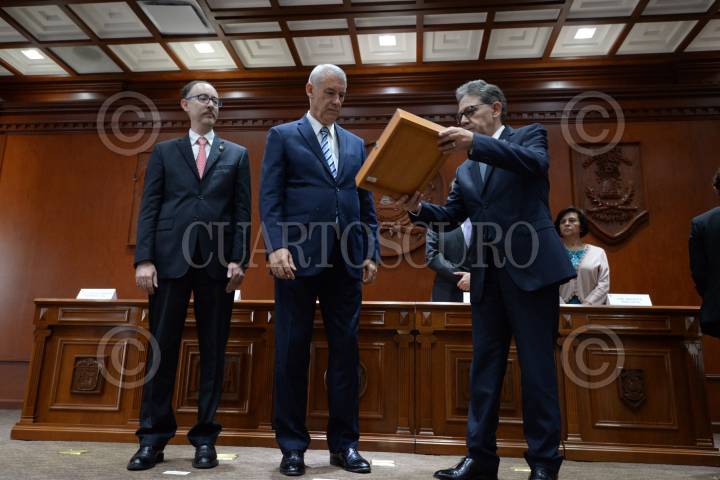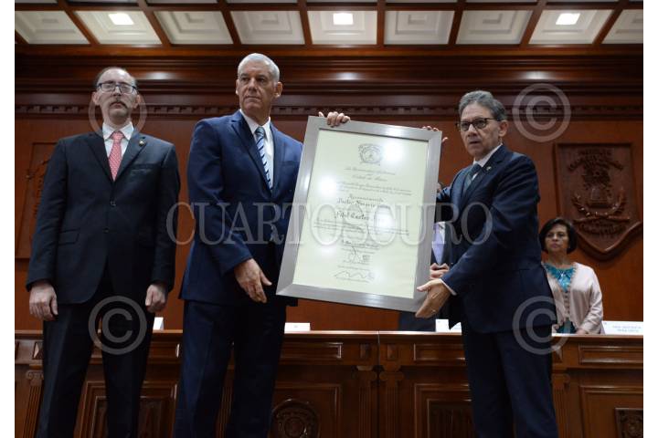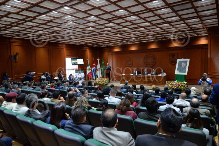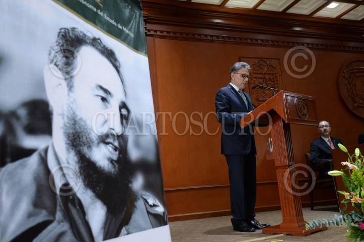 TOLUCA, ESTADO DE MÉXICO, 10OCTUBRE2017.- La Universidad Autónoma del Estado de México, encabezada por Alfredo Barrera Baca entregó el Doctorado Honoria Causa al Comandante Fidel Castro, ex presidente de Cuba, recibiendo el documento el embajador de Cuba en México Pedro Juan Núñez Mosquera. FOTO: ARTEMIO GUERRA BAZ / CUARTOSCURO.COM