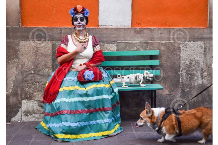 GUANAJUATO, GUANAJUATO, 11OCTUBRE2024.- Una mujer disfrazada de "catrina" toma un descanso sobre la calle Luis González Obregón. FOTO: MARIO JASSO/CUARTOSCURO.COM