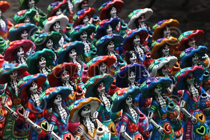 Venta de catrinas para adornar la casa en el mercado de este pueblo mágico. Imagen tomada el pasado sábado en Tepoztlán, Morelos