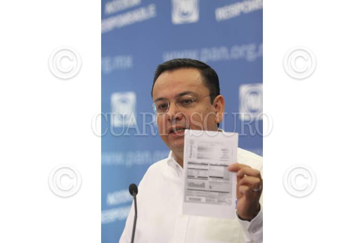 MÉXICO, D.F., 26MAYO2009.- Gemán Martínez Cazares, dirigente nacional del PAN, durante su conferencia de prensa en su sede general de avenida Coyoacán, el panista expreso sus condolencia a la familia y a el periódico La Opinión por el levantón y posterior ejecución de Eliseo Barrón, reportero que cubría la fuente policíaca de este diario, el día de ayer. En la imagen Martinez Cazares, sostiene copia de la boleta de pago de agua del inmueble que ocupa el PRI en Nuevo León, ya que aseguró que estos tiene un adeudo de 66 meses. FOTO: MOISÉS PABLO/CUARTOSCURO.COM