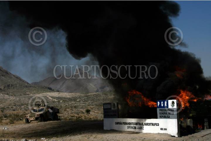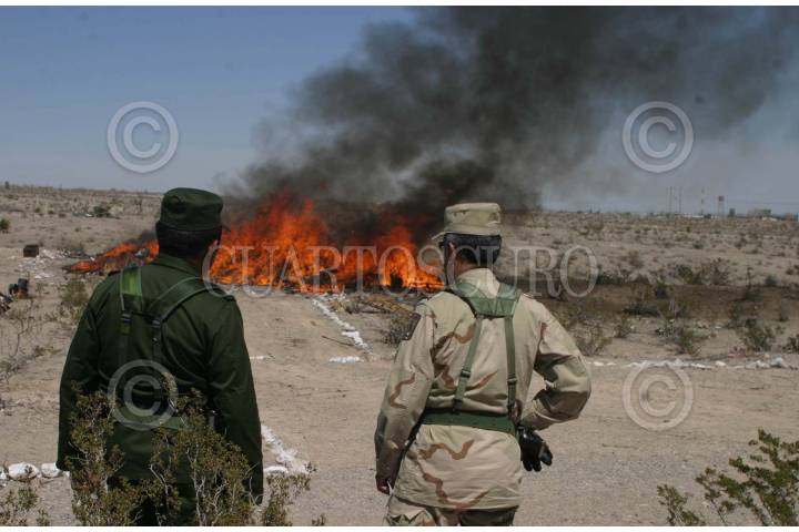 CIUDAD JUAREZ, CHIHUAHUA; 08NOVIEMBRE2008.- Luego de reconocer que Cd. Juarez es una de la zonas del país en donde existe un alto indice de trafico, venta y consumo de enervantes, y que es un foco rojo que pone en riesgo la estabilidad y desarrollo; este medio día se llevo a cabo la incineración de drogas decomisadas en diversos puntos como parte del "operativo conjunto Cd. Juarez". De acuerdo con las autoridades, el valor total de las drogas incineradas suma un poco mas de $ 153 millones de pesos. FOTO: GUADALUPE PEREZ/CUARTOSCURO.COM