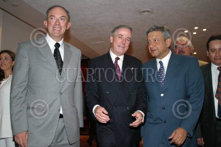 México, D.F. 15 JULIO 2004.- José Luis Menchelli, Gonzálo Brockmann, presidente saliente y entrante respectivamente de la Asosiación de Hoteles de la Cd. de México y Andrés Manuel López Obrador, jefe de Gobierno del D.F. al termino de la toma de protesta de la nueva mesa directiva hotelera 2004-2006. FOTO: Sandra Perdomo/CUARTOSCURO.COM