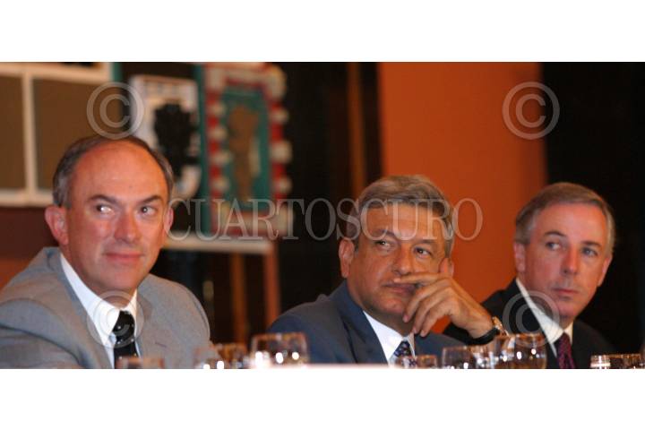 México, D.F. 15 JULIO 2004.- José Luis Menchelli, presidente saliente, Andrés Manuel López Obrador, jefe de Gobierno del D.F. y Gonzálo Brockmann, presidente entrante de la Asosiación de Hoteles de la Cd. de México en el evento de la toma de protesta de la nueva mesa directiva hotelera 2004-2006. FOTO: Sandra Perdomo/CUARTOSCURO.COM