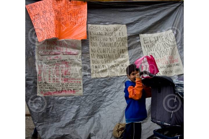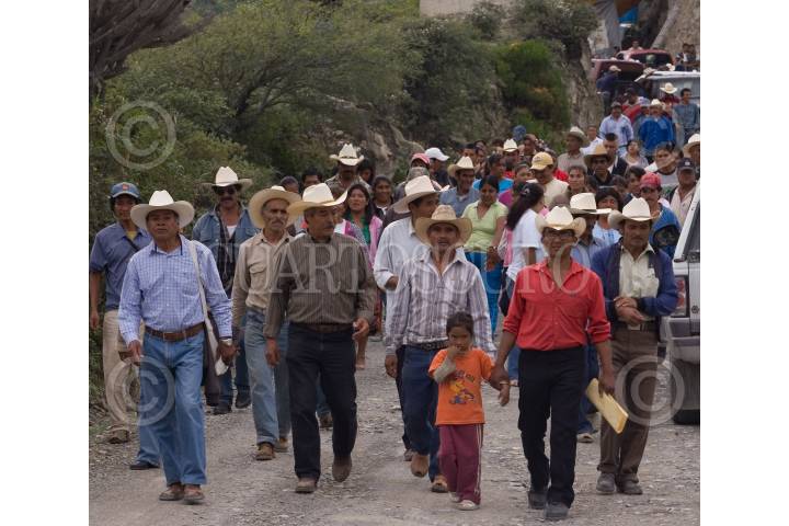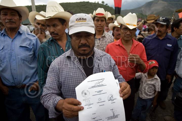 CADERYTA, QUERETARO, 29OCTUBRE2009.- Más de 400 comuneros y ejidatarios de la delegación de Maconí, en el alejado Municipio de Caderyta mantienen un bloqueo a la empresa ICA (Ingenieros Civiles Asociados), que construye la infraestructura llamada Acueducto II, que surtirá de agua a la capital del Estado, con un costo de original de dos mil 854 millones de pesos. La protesta comunera es por incumplimiento de los acuerdo firmados con la CEA (Comisión Estatal de Agua). A esto respondieron manifestandose, marcharon e hicieron una junta informativa ante los más de 400 representantes de las 18 comunidades. Donde acordaron una mega marcha a la capital del estado y continuarán los bloqueos, además de formar una Asociación Civil por la Defenza del Agua. Al evento los acompañó el Balfre Vargas, diputado federal por el PRD y secretario de la Mesa directiva del Congreso de la Unión, quién se comprometió a llevar al Congreso de la Unión el problema. FOTO: DEMIAN CHÁVEZ/CUARTOSCURO.COM
