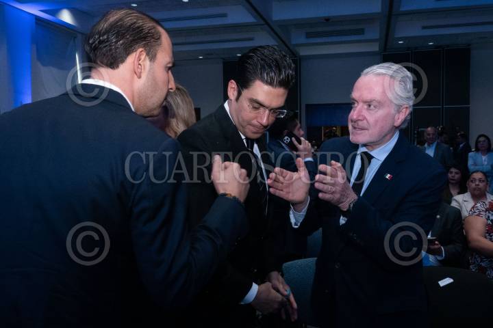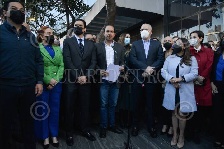 Marko Cortés, dirigente nacional del PAN, Jorge Romero Herrera, diputado y coordinador del PAN; Julen Rementería, senador y coordinador del PAN, y legisladores pianistas acudieron a las instalaciones de la Fiscalía General de la República (FGR) para presentar una denuncia para que se investiguen los contratos de la propiedad de José Ramón López Beltrán, hijo del presidente Andrés Manuel López Obrador, ubicada en Houston Texas.