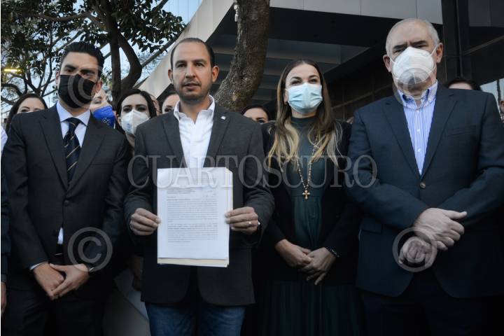 Marko Cortés, dirigente nacional del PAN, Cecilia Patrón Laviada, diputada del PAN, Jorge Romero Herrera, diputado y coordinador del PAN; Julen Rementería, senador y coordinador del PAN, y legisladores pianistas acudieron a las instalaciones de la Fiscalía General de la República (FGR) para presentar una denuncia para que se investiguen los contratos de la propiedad de José Ramón López Beltrán, hijo del presidente Andrés Manuel López Obrador, ubicada en Houston Texas.